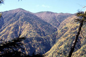 小黒川上流には信州大学の演習林がある。野田場の手前からは、このみごとな自然林を将棊頭山と一緒に遠望することができる。山の斜面の自然林をよくみると、垂直方向に植生が変化していく様子がよく分かる。 このあたりは地形的にも面白い。将棊頭山から下ってくる沢が水平に伸びる尾根にさえぎられて、東へ大きく屈曲している。この尾根の上にはもしかしたら河床礫があるかも知れないと思って、以前調べてみたが、尾根の先端(東)付近に見つかっただけだった。上流側には花崗岩、下流側の屈曲部や水平に伸びる尾根には変成岩が分布しているので、岩相境界が差別侵食によって掘りまれてできた地形かもしれない。 |