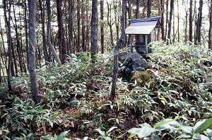 馬返しには、すでに廃道となった権兵衛峠への標識がある。権兵衛峠へのルートは、頭まですっぽりと入るほどのササが生い茂っているので、安易に入るとたいへん危険だ。 東側には、線状凹地を隔てて、山の神様が祀ってあった。ここから東へ派生する尾根は、途中でやや傾斜が緩やかとなるところがある。このあたりは等高線間隔が広くなったり狭くなったり、傾斜が異常にみえる。 |