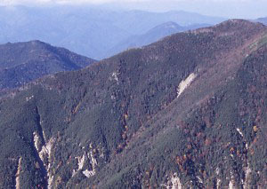 八ヶ岳の縞枯山のように、茶臼山西斜面にも縞枯れのような立ち枯れが見られる。 縞枯れとは立ち枯れとなった針葉樹が何列も平行に発達しているもので、その成因が長い間謎とされてきた。最近では、風衝地での倒木更新の一つと解釈されている。つまり、シラビソなどの針葉樹が成長して樹高が高くなると、強風をまともに受けるようになり、細い根が切られて立ち枯れしてしまう。すると、その背後が風を強く受けるようになるので、立ち枯れが斜面を上昇していく。立ち枯れの場所には、次の世代のシラビソの幼樹が育っていて、再び樹高が大きくなると立ち枯れするらしい。 茶臼山の西斜面も西からの強風が吹き上げてくるために、縞枯れのような倒木更新をしているのだろう。 |
