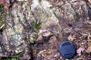 白川分岐付近からは傾斜が急となる。これは、山をつくっている岩石が、軟らかい粘板岩から硬いチャートに変わったからだ。 チャートはほとんど二酸化珪素からできていて、非常に緻密で硬い岩石だ。もともとは、大洋にだたよっている放散虫などの珪酸質の殻が沈殿してできたものだ。この付近のチャートは花崗岩の熱の影響をうけているので、放散虫の殻を確認することはできない。 チャートの分布域をすぎると、転石は再び粘板岩となるが、前とちがって表面にぶつぶつと小さな穴が空いている。これはおそらく菫青石の斑状変晶が風化して抜けてしまった穴なのだろう。 |