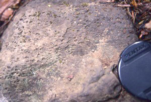 将棊頭山はその名の通り、ゆるやかな山頂部をつくっているので、どこが山頂なのか分かりづらい。山頂の標識やケルンがあるので、そのあたりが山頂なのだろう。 山頂のすぐ南には天水岩がある。天水岩は2×4mほどの水平に割れた花崗岩の巨石で、この上には直径40cmほどの底の浅い円形の窪みがある。窪みには水がたまっていることが多く、これが天水岩の由来かも知れない。よくみると、他にも小さな窪みが二つある。こちらは円というよりも楕円だ。 このような窪みは、凍結融解による侵食作用の一つでグナマというものらしい。 |