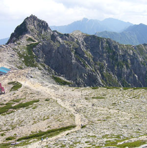 中岳の周囲には傾斜の緩やかな砂礫地が広がっている。とくに宝剣岳との間は驚くほど平坦で、宝剣岳などの険しい岩塔と著しい対照をなしている。 緩傾斜地には岩塊地、階状土、雪窪などのさまざまな小地形が見られる。それぞれ高山帯特有の周氷河地形だ。岩塊地は岩盤が強い凍結破砕作用によって砕かれた岩塊が集合したもので、氷期には間隙水の凍結融解作用によって下方へ移動していたらしい。階状土は砂礫層が凍結融解作用によって斜面下方へゆっくり移動するソリフラクションによってできたものだ。このとき、粗粒な礫ほど前方へ押し出されて停止するため後方に細かい砂礫の平坦地ができるという。雪窪は残雪が残りやすい場所にできた窪地だ。残雪地は植生が発達しないので雪解け後にソリフラクションや流水による侵食などを受けやすく、そのために窪地になりやすいという。これらの地形をつくる作用は、大きく見ると起伏のある地形を平坦化する働きをもっている。さらに冬季の強風が平坦化を促進しているのだろう。 一方、宝剣岳の岩塔やカール壁の荒々しい岩壁が隣接している。これらの花崗岩にはもともと垂直な節理(割れ目)が発達している。これらの節理は表面からしみ込んだ水の凍結によって広がり、岩盤は不安定になる。豪雨や地震が発生すると、不安定な部分が剥がれ落ちて岩壁下に岩塊地ができる。岩壁には再び垂直な節理に規制された新鮮な岩が現れるというわけだ。 このようにしてみると、対照的な平坦地と岩壁や岩塔は、ともに寒冷気候がつくったものといえる。 |
