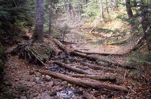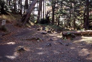 尾根道を登っていくと、足下の転石は変成岩から花崗岩へと移り変わる。しばらくいくと閃緑斑岩の貫入岩が現れる。これは伊那前岳山頂付近に分布している貫入岩の延長なのだろう。 再び黒っぽい転石が目立つようになり、変成岩が分布するようになる。ちょうど地形も緩やかになって尾根を横断する線状凹地がでてくる。ここが清水平だ。名前通り湧水があるが、秋にはときどき枯れているので注意が必要だ。 |