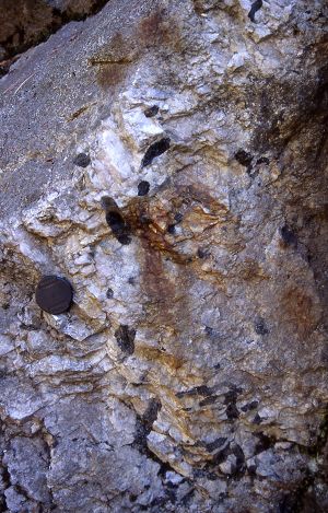 しばらく林道歩きをしながら、岩石や景観を楽しもう。北御所林道沿いには縞模様の発達した黒雲母片麻岩や黒っぽい雲母片岩が分布している。ときどき花崗岩が挟まれている。よくみると結晶の粒が大きいペグマタイトだ。白雲母を含むことがあるので探してみよう。 北御所谷をわたる橋までくると、両側には花崗岩が分布するようになる。この付近には電気石を含むペグマタイトが見られる。電気石は黒っぽい長柱状の鉱物で、断面は六角形になることが多い。長さ10cm以上の大きな電気石も見つかるかもしれない。電気石は加熱すると結晶の両側で電荷を帯びることからこの名前がついた。 ここでは変成岩と花崗岩との境界を探すのもいいだろう。この地質境界は北東−南西方向へ続いていて、これから歩く登山道沿いでも確認できる。 |