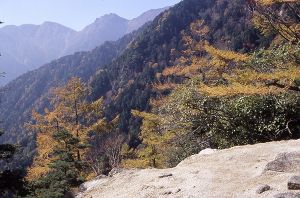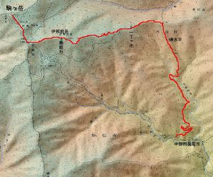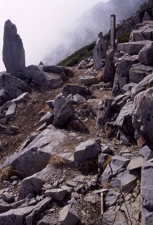 北御所登山道は伊那谷の学校登山でよく利用されているコースだ。そのため他のコースに比べて良く整備されており、利用者も比較的多い。 北御所谷入口からの林道歩きにはじまるが、本格的な尾根道までの準備運動には適当だろう。林道沿いの岩石を観察するのもおもしろい。 尾根に取り付いてからは、移り変わる森林景観とともに清水平の湧水や一丁ヶ池などの水景観も興味深い。 伊那前岳周辺には木曽駒花崗岩中に貫入した閃緑斑岩が見られる。高遠藩郡代坂本天山の勒銘石は、この岩石に彫り込まれている。勒銘石の碑文はほとんど読めないるが、昭和初期に彫られた副碑で読むことができる。勒銘石は、1783年(天明3年)の駒ヶ岳検分の際に彫られたものらしい。 |