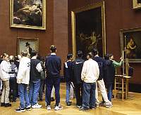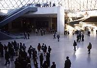今日は、ルーブル、オルセーの2つの美術館とグラン・パレにある発見の宮殿へ行く。再び、Palais Royal Musee du Louvre駅まで行き、まずルーブル美術館をみる。門を入ると、広場の真ん中にガラスのピラミッドがあった。ここが入口だ。まだ開館前なのに人がたくさん並んでいる。それにしても、周囲の歴史的建造物の中に、近代的?なガラスのピラミッドがどうしても似合うとは思えない。しかし、ピラミッドから中に入り、そのまま地下へ移動していくと、広くて明るく近代的なホールに景観がスムーズに変わる。もしかしたらこのガラスのピラミッドは、入口の演出としては最高なのかもしれないと思えてくる。 |