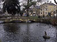 ここからBourton-on-the-Waterへ向かう。途中で地図に載っていた風車?(Windpump)をさがすが、見つからなかった。Bourton-on-the-Waterは人がよく集まる観光地のようだ。駐車場がかなり広い。石垣の間の小径をしばらく歩くと、川沿いの明るいオープンスペースが現れ、周囲にはきれいなお店や民家が並んでいた。川には石橋がいくつもかかり、水辺にはたくさんの水鳥が遊んでいた。 |