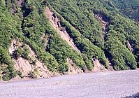 尾根の中程からてっぺんまでが崩れていて、下部は深い谷になっていて滝もみることができる。谷の出口である大井川の合流点には、みごとな崖錐性の扇状地ができている。大雨のたびに扇状地の形が変わるのだろう。草がほとんど生えていない。