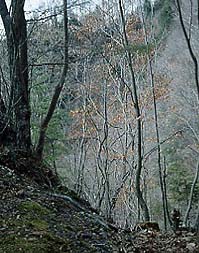 ガレを注意深く巻いて、切り離された上流の谷へでる。この谷はきれいな水が流れていてたいへん美しいところだ。この流れをさか登ると再び崩壊地にでる。ここから朝日岳は目と鼻の先ほどだが、山道はほとんど分からないので、方角の見当をつけて尾根に上がり山頂へつめることになる。この間、背の丈以上に生い茂ったササ原の猛烈な藪漕ぎとなる。ササが低くなっているところでは、ササや針葉樹の幹にシカの食痕やフンがいたるところでみられる。