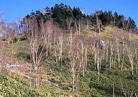尾高山への登り口は稜線の西側にある。尾高山までは歩きやすい遊歩道ができていて、2時間ほどでたどりつける。背の低いササ原から、しだいに原生林とコケが美しい道となる。