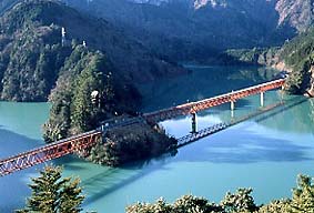 長島ダムは平成13年に竣工した高さ109mの重力式の巨大なダムだ。このダムによって長島、犬間、唐沢の集落が水に沈んだ。同時に、大井川鉄道も付け替えられ、ダムによってできた標高差を、アプト式の歯車によって強引に登ることになった。