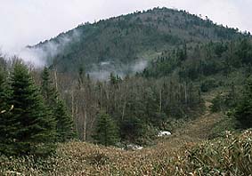 新窪乗越から2つピークを越えると、平坦地が目の前に広がる。ササと疎林が明るい高原状の景観をつくっている。台地状の鹿の踊場をすぎると、北北東−南南西方向の線状凹地が発達している広い稜線を歩くようになる。線状凹地の方向は、そのまま割れやすいスレート劈開の方向だ。