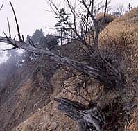 西日影沢の谷と分かれて北へ向かうと、正面に荒々しい崩壊地がみえてくる。これが大谷崩れだ。崩壊地入口にある扇ノ要の手前までは、堆積土砂の上に開かれた林道を歩き、ここから崩壊地を横にみながらザクザクの道を歩く。崩壊地の上から下まで標高差800mもあるので、登り下りともたいへんだ。稜線の新窪乗越にでれば崩壊の大きさがよく分かるだろう。