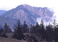 時間があれば山頂から西へ急斜面を下り、大笹峠付近で地質を観察しよう。ここには井川小河内と雨畑を結ぶ林道ができている。峠から西は泥質岩中に砂岩レンズが含まれていて全体が破砕帯のように変形している。これは四万十帯犬居層群の混在岩だ。峠の東には、緑色岩とペラペラと割れやすいきれいなスレートが分布している。これらは瀬戸川層群のメンバーだ。つまりちょうど峠付近に笹山構造線が走っているわけだ。